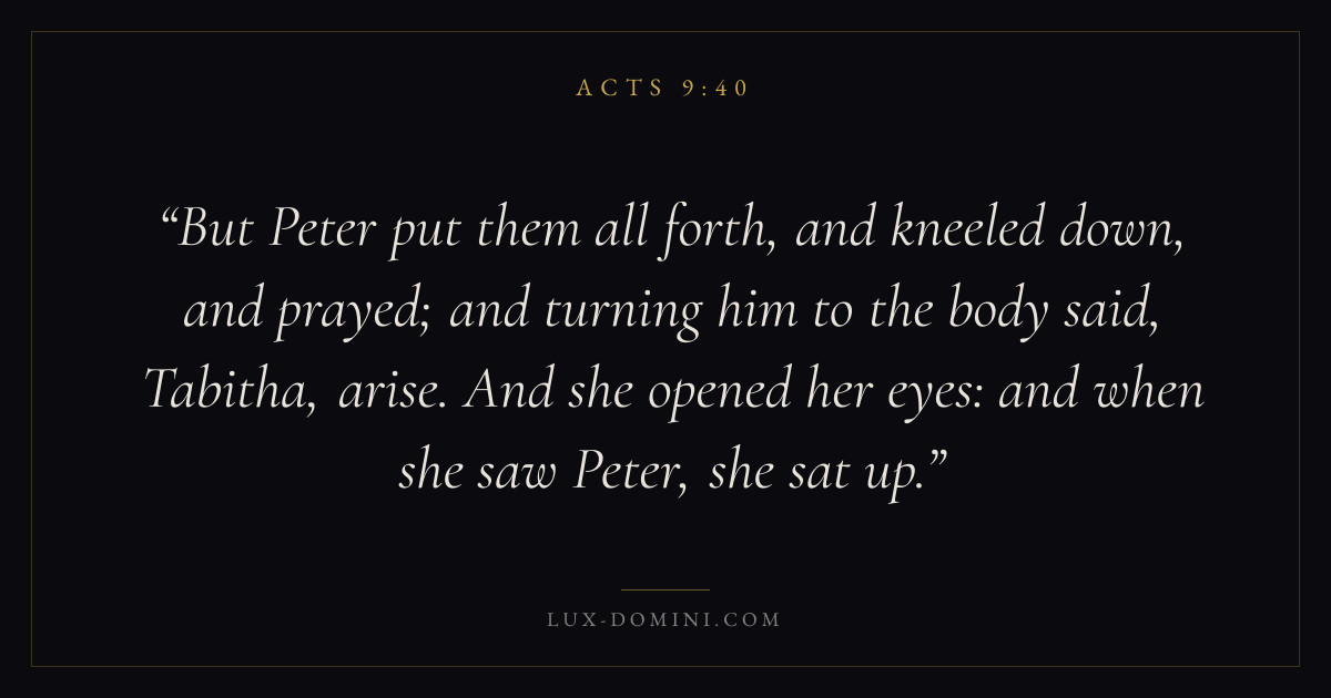 But Peter put them all forth, and kneeled down, and prayed; and turning him to the body said, Tabitha, arise. And she opened her eyes: and when she saw Peter, she sat up.