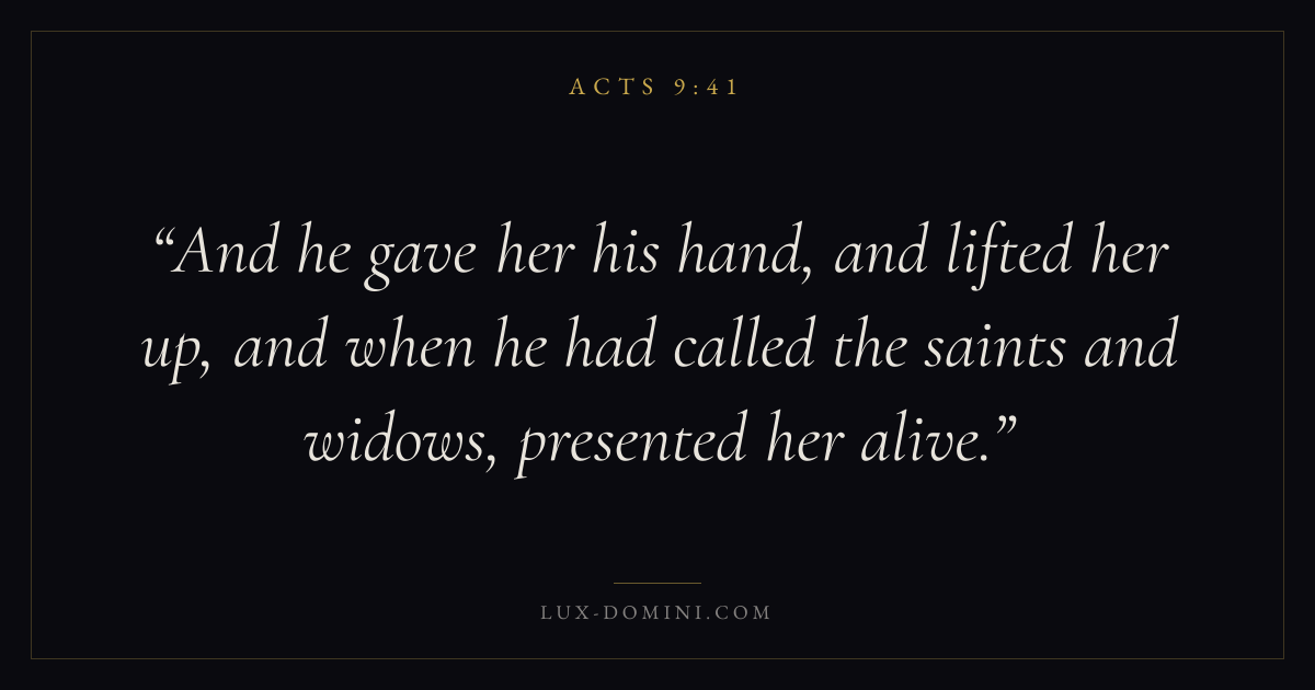 And he gave her his hand, and lifted her up, and when he had called the saints and widows, presented her alive.
