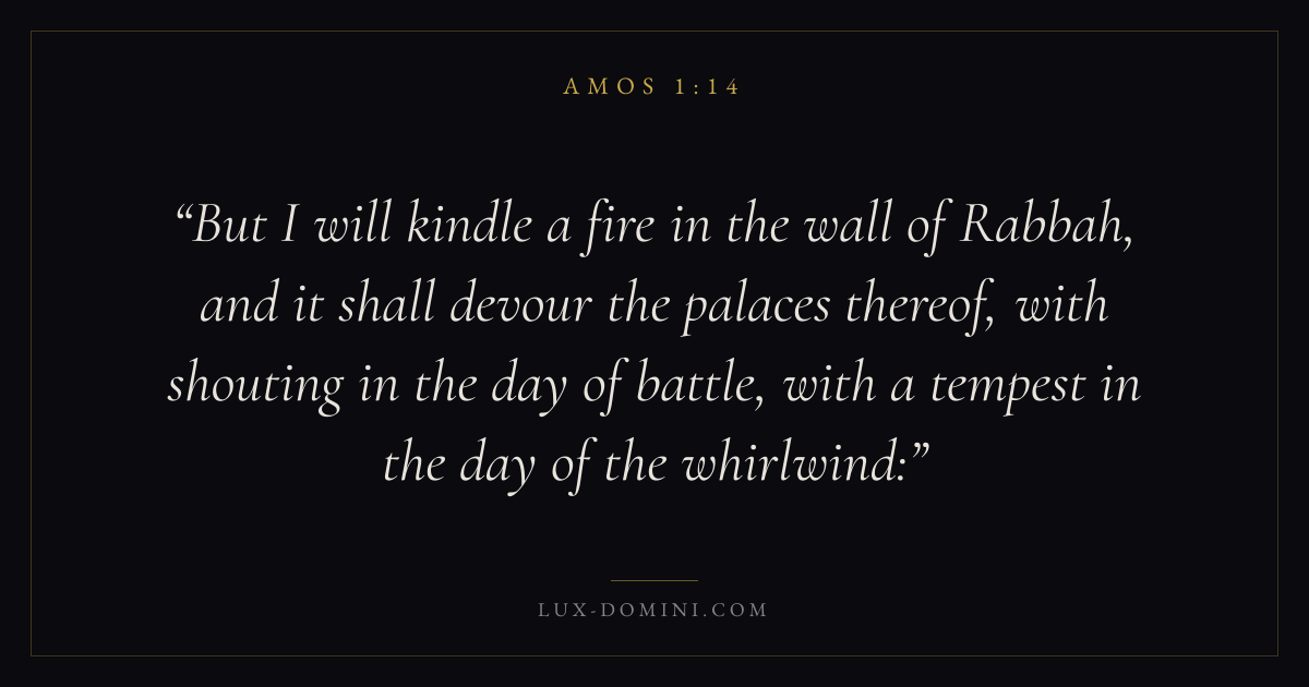 But I will kindle a fire in the wall of Rabbah, and it shall devour the palaces thereof, with shouting in the day of battle, with a tempest in the day of the whirlwind: