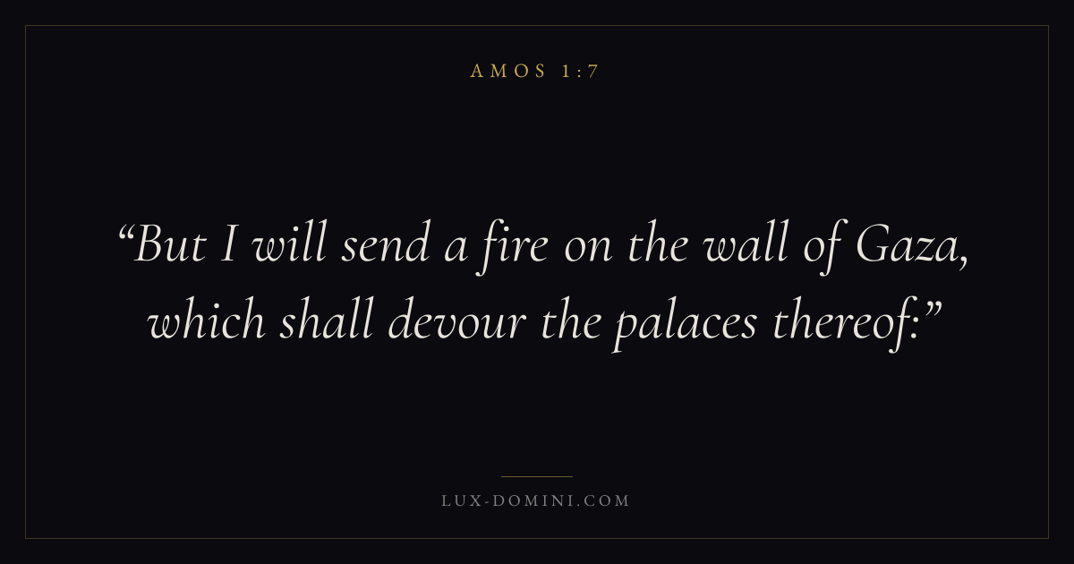 Books / Amos / Chapter 1 / Verse 7 ← Amos 1:6 Amos 1:7 Amos 1:8 → But I will send a fire on the wall of Gaza, which shall devour the palaces thereof: Download verse card Share on Twitter Share on Facebook Pin it ✦ Key themes Justice and mercyJusticeFalse worshipJudgment Read with Amos 1:6Amos 1:8Micah 6:8Amos 5:24 Related topics Bible verses about justice and mercy Glossary Gaza Place Called also Azzah, which is its Hebrew name. Modern identification: Tell Harube. ✦ Amos Chapter 1 verses V. 1 V. 2 V. 3 V. 4 V. 5 V. 6 V. 7 V. 8 V. 9 V. 10 V. 11 V. 12 V. 13 V. 14 V. 15