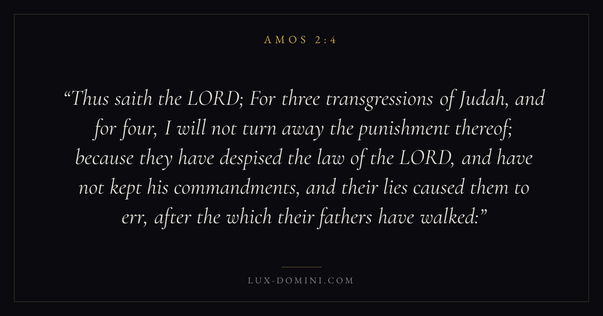 Thus saith the LORD; For three transgressions of Judah, and for four, I will not turn away the punishment thereof; because they have despised the law of the LORD, and have not kept his commandments, and their lies caused them to err, after the which their fathers have walked: