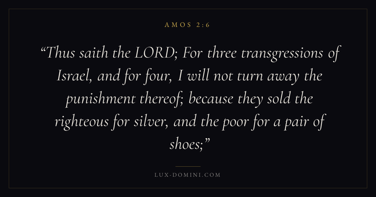 Thus saith the LORD; For three transgressions of Israel, and for four, I will not turn away the punishment thereof; because they sold the righteous for silver, and the poor for a pair of shoes;