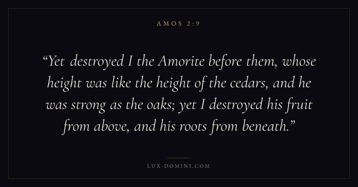 Yet destroyed I the Amorite before them, whose height was like the height of the cedars, and he was strong as the oaks; yet I destroyed his fruit from above, and his roots from beneath.