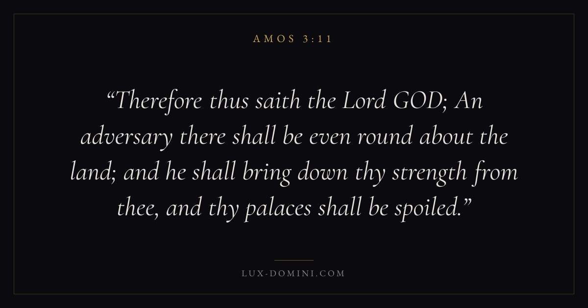 Therefore thus saith the Lord GOD; An adversary there shall be even round about the land; and he shall bring down thy strength from thee, and thy palaces shall be spoiled.