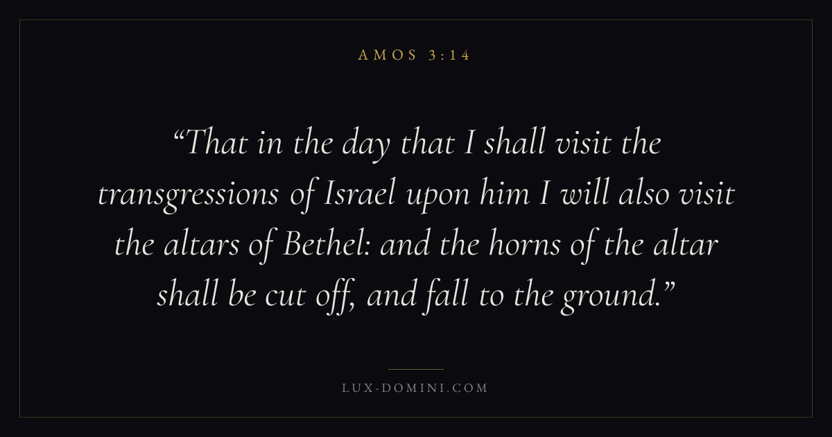 That in the day that I shall visit the transgressions of Israel upon him I will also visit the altars of Bethel: and the horns of the altar shall be cut off, and fall to the ground.