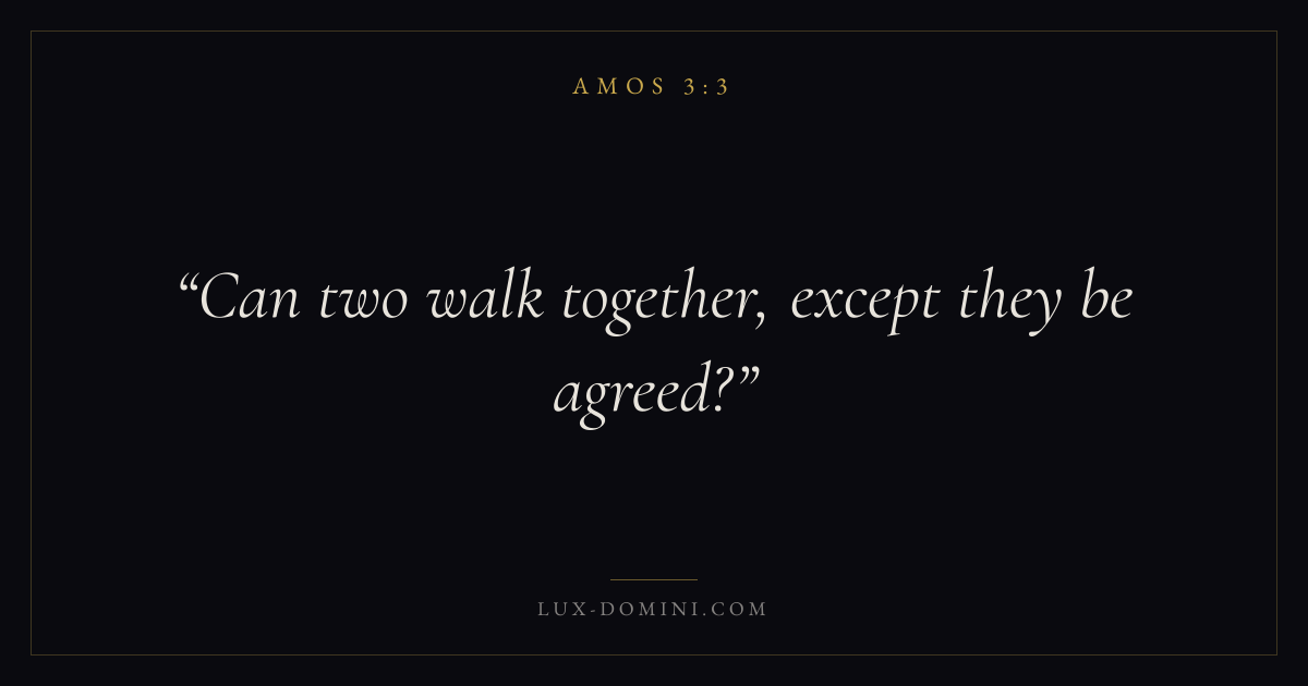 Books / Amos / Chapter 3 / Verse 3 ← Amos 3:2 Amos 3:3 Amos 3:4 → Can two walk together, except they be agreed? Download verse card Share on Twitter Share on Facebook Pin it ✦ Key themes Justice and mercyPeaceJusticeFalse worship Read with Amos 3:4Micah 6:8Amos 5:24John 14:27 Related topics Bible verses about justice and mercyBible verses about peace ✦ Amos Chapter 3 verses V. 1 V. 2 V. 3 V. 4 V. 5 V. 6 V. 7 V. 8 V. 9 V. 10 V. 11 V. 12 V. 13 V. 14 V. 15