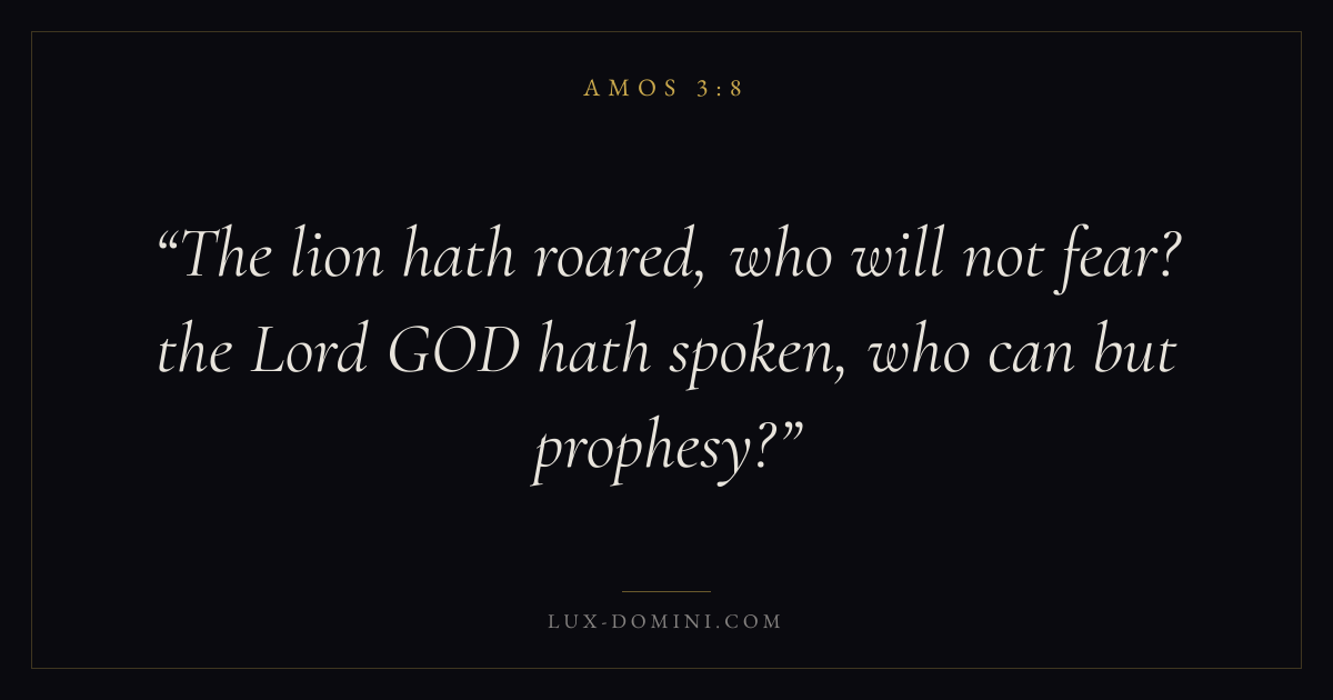 Books / Amos / Chapter 3 / Verse 8 ← Amos 3:7 Amos 3:8 Amos 3:9 → The lion hath roared, who will not fear? the Lord GOD hath spoken, who can but prophesy? Download verse card Share on Twitter Share on Facebook Pin it ✦ Key themes Anxiety and fearJustice and mercyPeaceJustice Read with Amos 3:7Philippians 4:6Isaiah 41:10Micah 6:8 Related topics Bible verses about anxiety and fearBible verses about justice and mercyBible verses about peace ✦ Amos Chapter 3 verses V. 1 V. 2 V. 3 V. 4 V. 5 V. 6 V. 7 V. 8 V. 9 V. 10 V. 11 V. 12 V. 13 V. 14 V. 15