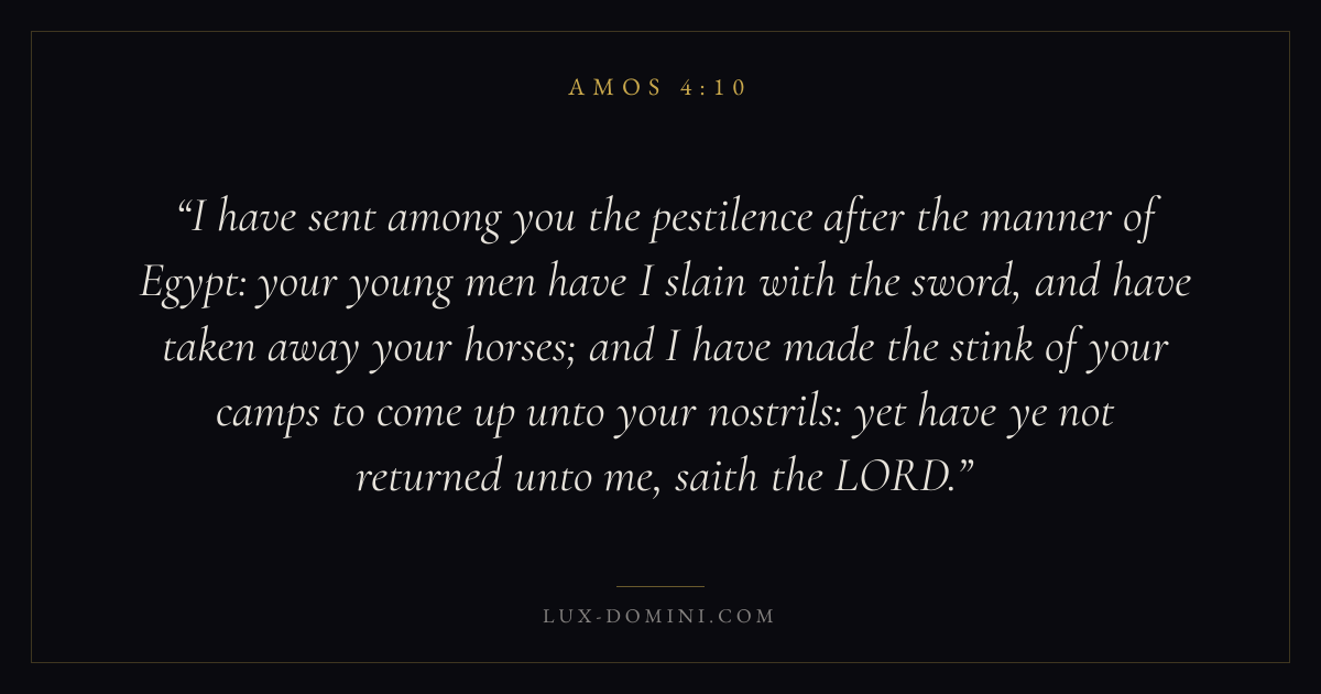I have sent among you the pestilence after the manner of Egypt: your young men have I slain with the sword, and have taken away your horses; and I have made the stink of your camps to come up unto your nostrils: yet have ye not returned unto me, saith the LORD.