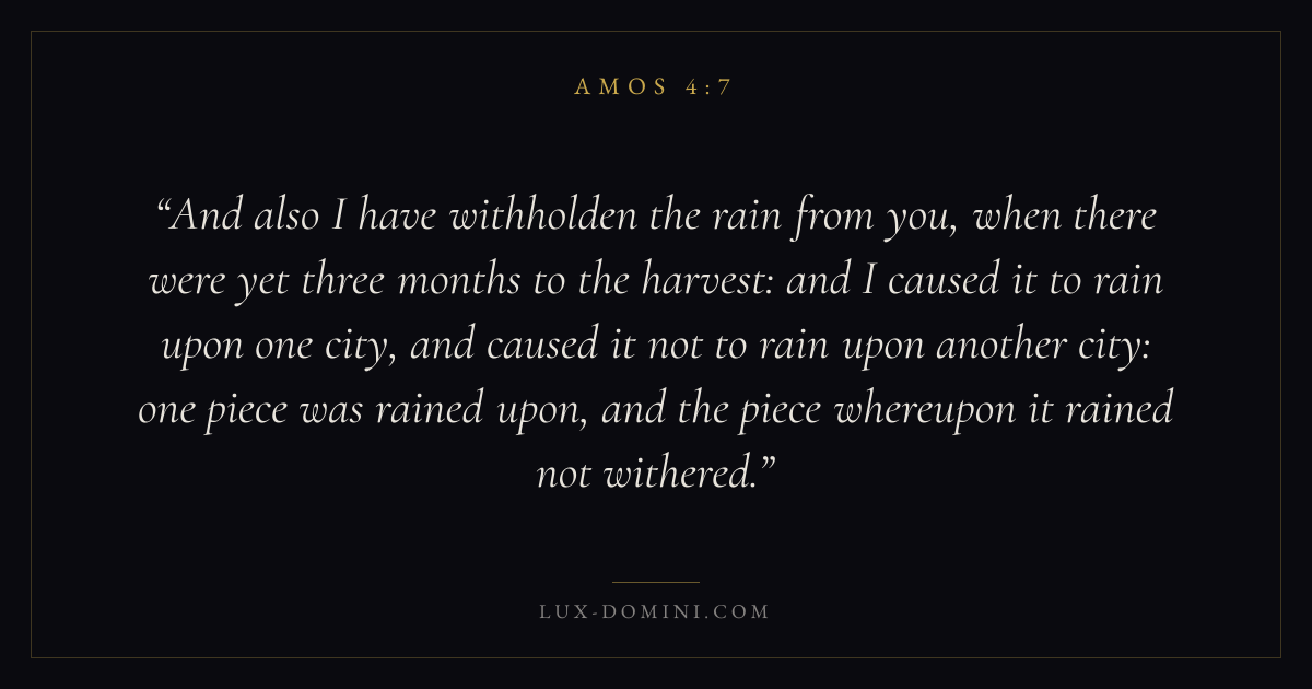 And also I have withholden the rain from you, when there were yet three months to the harvest: and I caused it to rain upon one city, and caused it not to rain upon another city: one piece was rained upon, and the piece whereupon it rained not withered.
