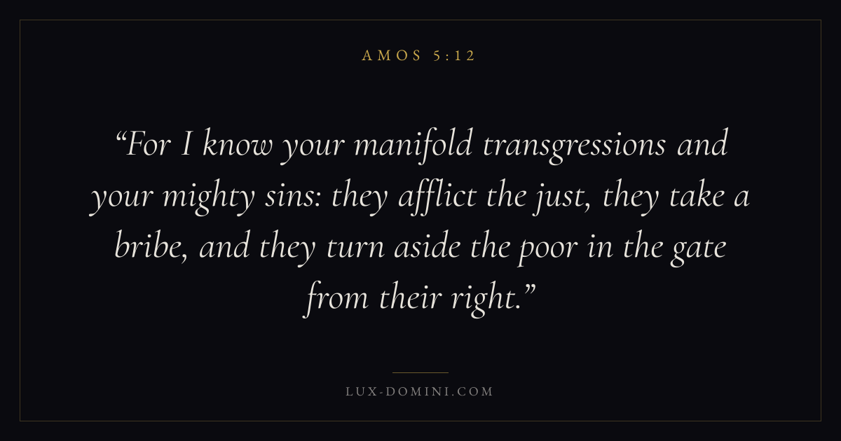 For I know your manifold transgressions and your mighty sins: they afflict the just, they take a bribe, and they turn aside the poor in the gate from their right.
