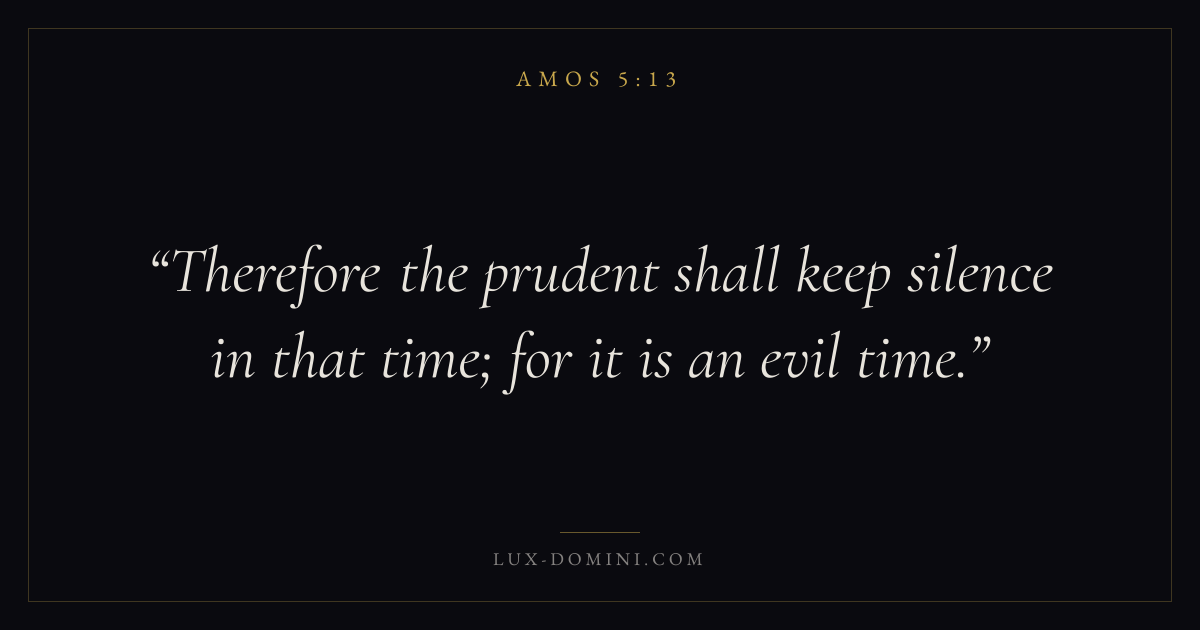 Books / Amos / Chapter 5 / Verse 13 ← Amos 5:12 Amos 5:13 Amos 5:14 → Therefore the prudent shall keep silence in that time; for it is an evil time. Download verse card Share on Twitter Share on Facebook Pin it ✦ Key themes Suffering and trialsJustice and mercyJusticeFalse worship Read with Amos 5:11Amos 5:12Romans 8:182 Corinthians 4:17 Related topics Bible verses about suffering and trialsBible verses about justice and mercy ✦ Amos Chapter 5 verses V. 1 V. 2 V. 3 V. 4 V. 5 V. 6 V. 7 V. 8 V. 9 V. 10 V. 11 V. 12 V. 13 V. 14 V. 15 V. 16 V. 17 V. 18 V. 19 V. 20 V. 21 V. 22 V. 23 V. 24 V. 25 V. 26 V. 27