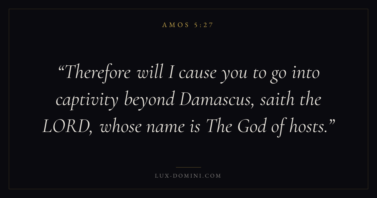 Books / Amos / Chapter 5 / Verse 27 ← Amos 5:26 Amos 5:27 Amos 6:1 → Therefore will I cause you to go into captivity beyond Damascus, saith the LORD, whose name is The God of hosts. Download verse card Share on Twitter Share on Facebook Pin it ✦ Key themes Justice and mercyJusticeFalse worshipJudgment Read with Amos 5:25Amos 5:26Micah 6:8Amos 5:24 Related topics Bible verses about justice and mercy Glossary Damascus Place Biblical settlement. Modern identification: Damascus. ✦ Amos Chapter 5 verses V. 1 V. 2 V. 3 V. 4 V. 5 V. 6 V. 7 V. 8 V. 9 V. 10 V. 11 V. 12 V. 13 V. 14 V. 15 V. 16 V. 17 V. 18 V. 19 V. 20 V. 21 V. 22 V. 23 V. 24 V. 25 V. 26 V. 27