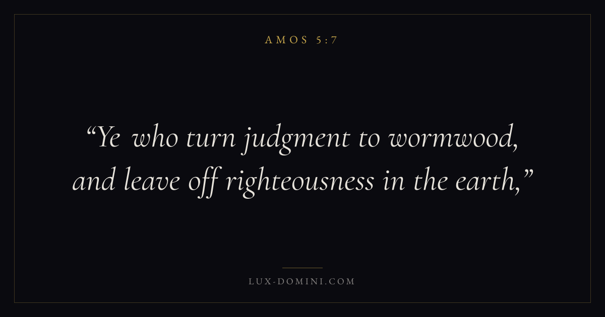 Books / Amos / Chapter 5 / Verse 7 ← Amos 5:6 Amos 5:7 Amos 5:8 → Ye who turn judgment to wormwood, and leave off righteousness in the earth, Download verse card Share on Twitter Share on Facebook Pin it ✦ Key themes Suffering and trialsJustice and mercyJusticeFalse worship Read with Amos 5:8Amos 5:9Romans 8:182 Corinthians 4:17 Related topics Bible verses about suffering and trialsBible verses about justice and mercy ✦ Amos Chapter 5 verses V. 1 V. 2 V. 3 V. 4 V. 5 V. 6 V. 7 V. 8 V. 9 V. 10 V. 11 V. 12 V. 13 V. 14 V. 15 V. 16 V. 17 V. 18 V. 19 V. 20 V. 21 V. 22 V. 23 V. 24 V. 25 V. 26 V. 27