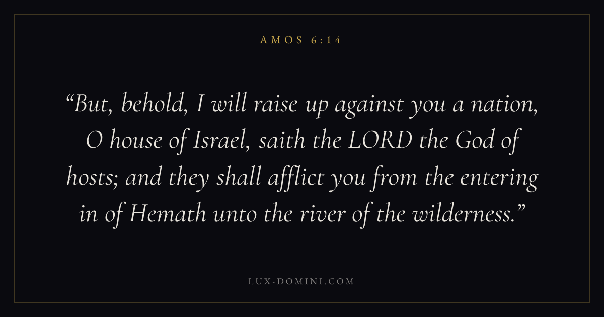 But, behold, I will raise up against you a nation, O house of Israel, saith the LORD the God of hosts; and they shall afflict you from the entering in of Hemath unto the river of the wilderness.