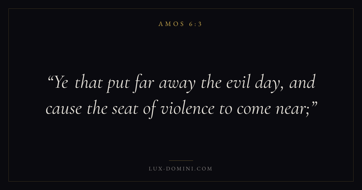 Books / Amos / Chapter 6 / Verse 3 ← Amos 6:2 Amos 6:3 Amos 6:4 → Ye that put far away the evil day, and cause the seat of violence to come near; Download verse card Share on Twitter Share on Facebook Pin it ✦ Key themes Justice and mercyHumilityJusticeFalse worship Read with Amos 6:4Amos 6:5Micah 6:8Amos 5:24 Related topics Bible verses about justice and mercyBible verses about humility ✦ Amos Chapter 6 verses V. 1 V. 2 V. 3 V. 4 V. 5 V. 6 V. 7 V. 8 V. 9 V. 10 V. 11 V. 12 V. 13 V. 14