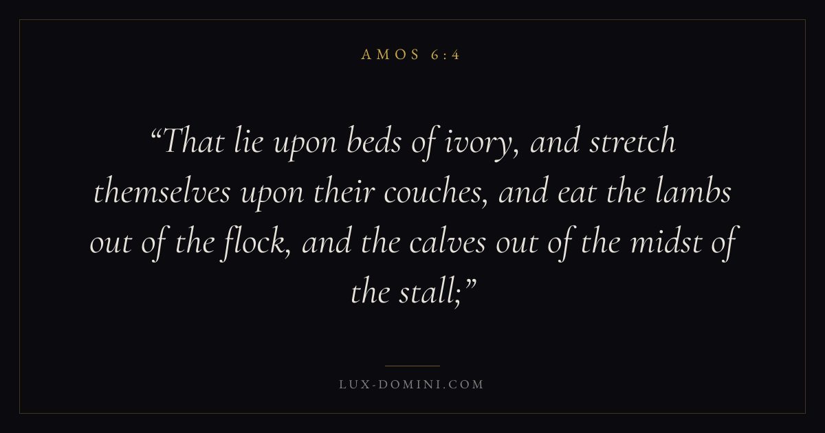 That lie upon beds of ivory, and stretch themselves upon their couches, and eat the lambs out of the flock, and the calves out of the midst of the stall;