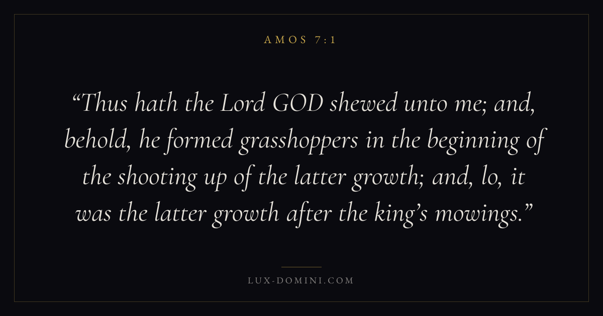 Thus hath the Lord GOD shewed unto me; and, behold, he formed grasshoppers in the beginning of the shooting up of the latter growth; and, lo, it was the latter growth after the king’s mowings.