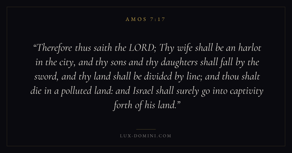 Therefore thus saith the LORD; Thy wife shall be an harlot in the city, and thy sons and thy daughters shall fall by the sword, and thy land shall be divided by line; and thou shalt die in a polluted land: and Israel shall surely go into captivity forth of his land.