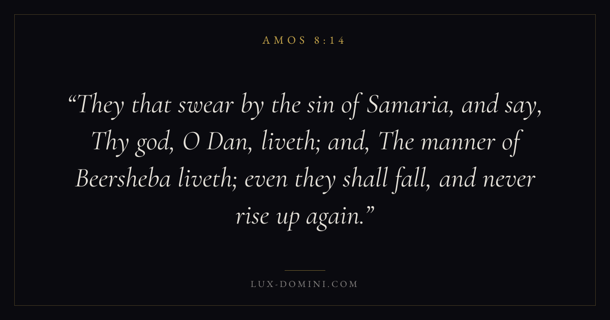 They that swear by the sin of Samaria, and say, Thy god, O Dan, liveth; and, The manner of Beersheba liveth; even they shall fall, and never rise up again.