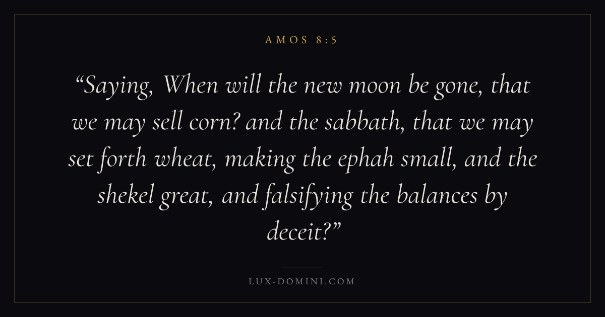 Saying, When will the new moon be gone, that we may sell corn? and the sabbath, that we may set forth wheat, making the ephah small, and the shekel great, and falsifying the balances by deceit?