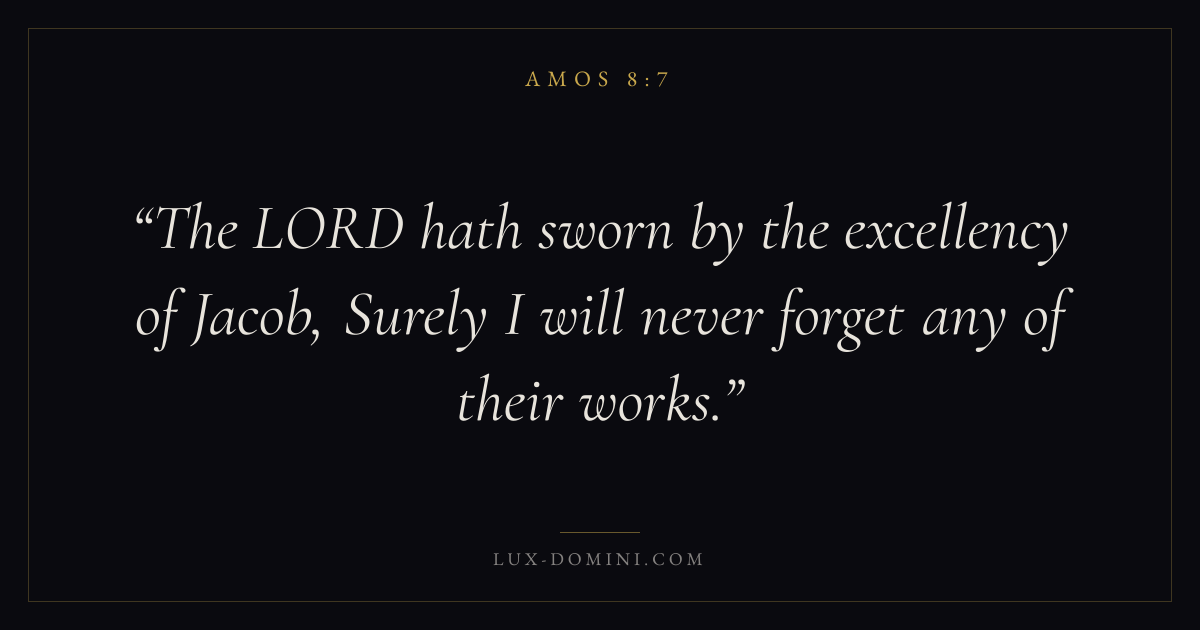 The LORD hath sworn by the excellency of Jacob, Surely I will never forget any of their works.