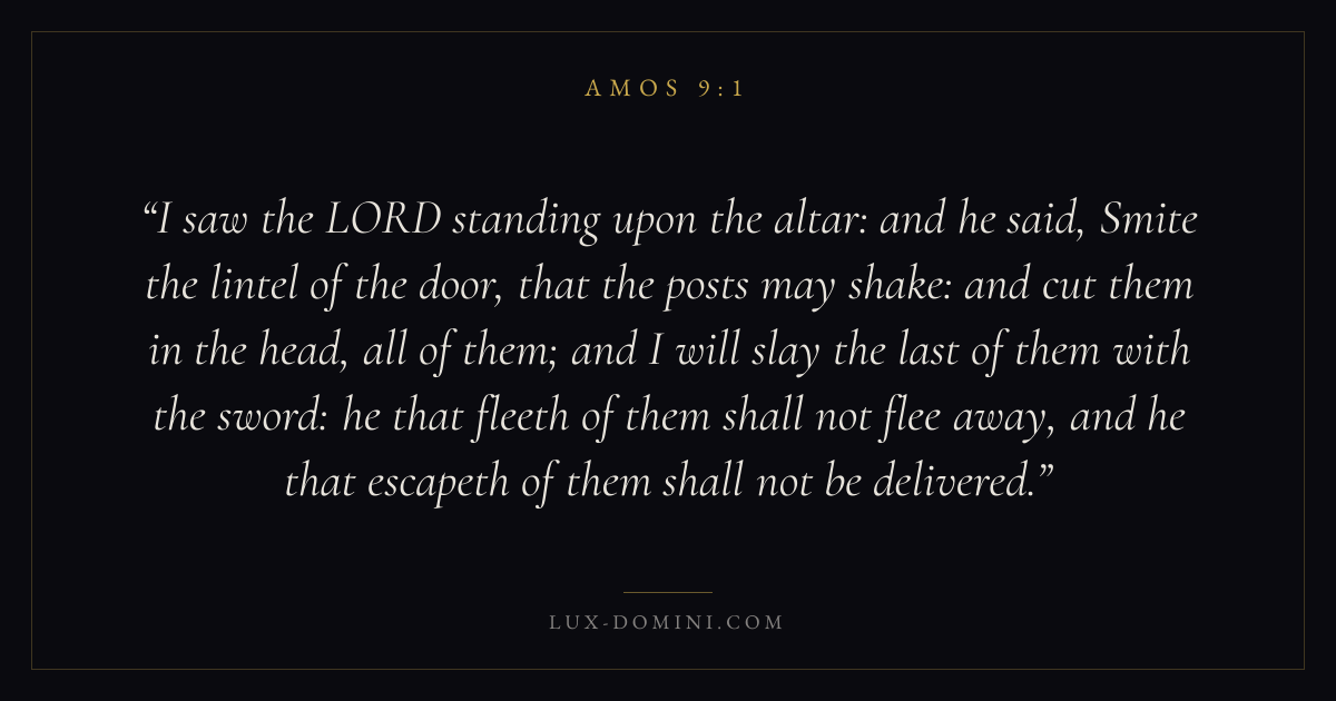 I saw the LORD standing upon the altar: and he said, Smite the lintel of the door, that the posts may shake: and cut them in the head, all of them; and I will slay the last of them with the sword: he that fleeth of them shall not flee away, and he that escapeth of them shall not be delivered.