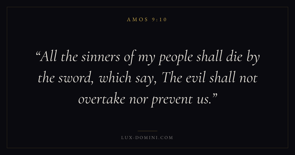 All the sinners of my people shall die by the sword, which say, The evil shall not overtake nor prevent us.