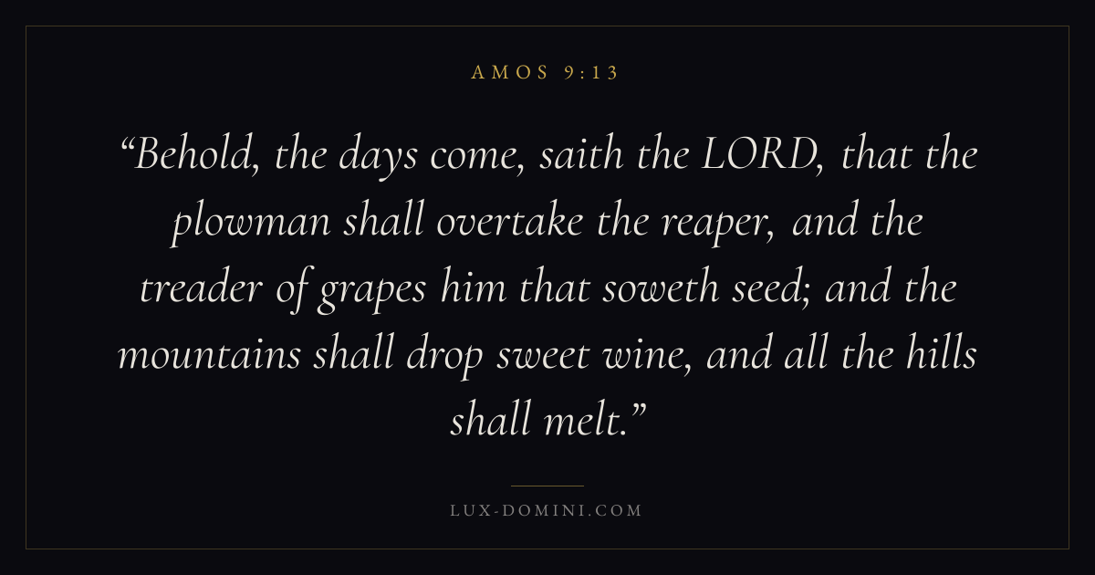Behold, the days come, saith the LORD, that the plowman shall overtake the reaper, and the treader of grapes him that soweth seed; and the mountains shall drop sweet wine, and all the hills shall melt.
