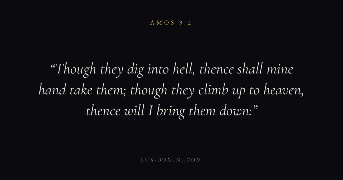 Though they dig into hell, thence shall mine hand take them; though they climb up to heaven, thence will I bring them down: