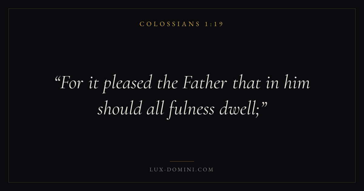 Books / Colossians / Chapter 1 / Verse 19 ← Colossians 1:18 Colossians 1:19 Colossians 1:20 → For it pleased the Father that in him should all fulness dwell; Download verse card Share on Twitter Share on Facebook Pin it ✦ Key themes FaithWisdomHumilitySupremacy of Christ Read with Colossians 1:18Colossians 1:20Hebrews 11:1Romans 10:17 Related topics Bible verses about faithBible verses about wisdomBible verses about humility ✦ Colossians Chapter 1 verses V. 1 V. 2 V. 3 V. 4 V. 5 V. 6 V. 7 V. 8 V. 9 V. 10 V. 11 V. 12 V. 13 V. 14 V. 15 V. 16 V. 17 V. 18 V. 19 V. 20 V. 21 V. 22 V. 23 V. 24 V. 25 V. 26 V. 27 V. 28 V. 29