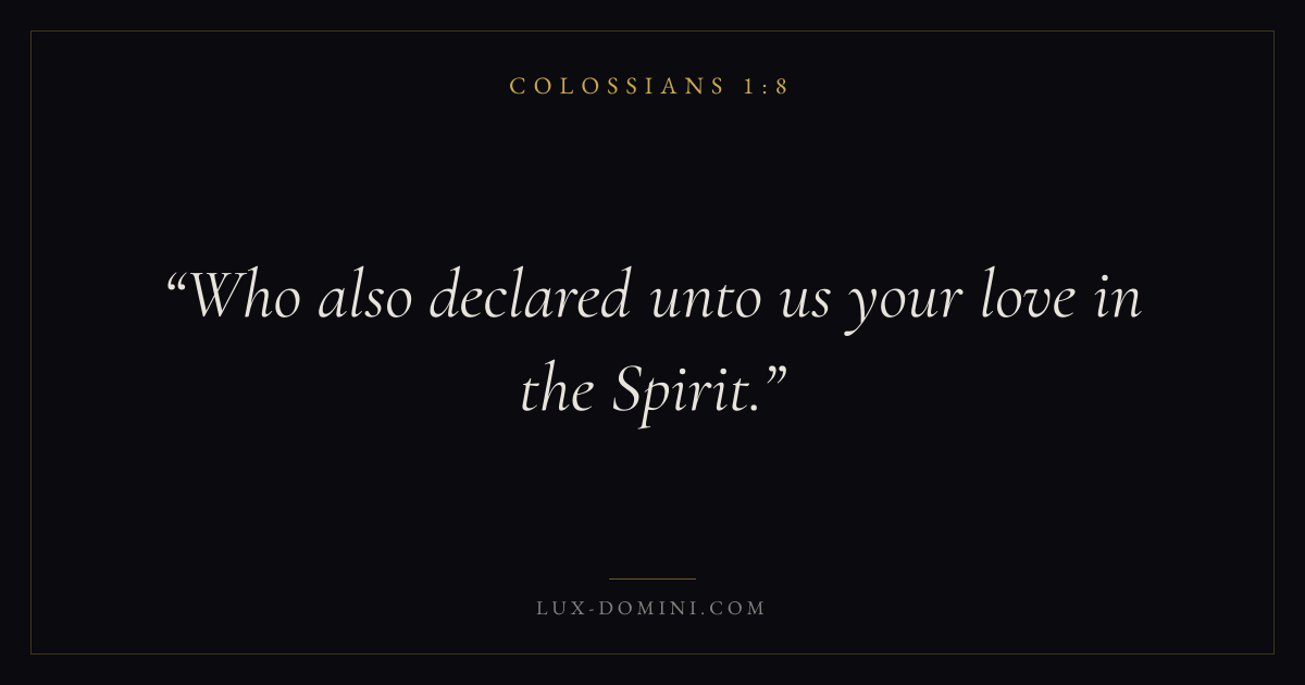 Books / Colossians / Chapter 1 / Verse 8 ← Colossians 1:7 Colossians 1:8 Colossians 1:9 → Who also declared unto us your love in the Spirit. Download verse card Share on Twitter Share on Facebook Pin it ✦ Key themes LoveWisdomTruthSupremacy of Christ Read with Colossians 1:9Colossians 1:10John 3:161 Corinthians 13:4 Related topics Bible verses about loveBible verses about wisdomBible verses about truth ✦ Colossians Chapter 1 verses V. 1 V. 2 V. 3 V. 4 V. 5 V. 6 V. 7 V. 8 V. 9 V. 10 V. 11 V. 12 V. 13 V. 14 V. 15 V. 16 V. 17 V. 18 V. 19 V. 20 V. 21 V. 22 V. 23 V. 24 V. 25 V. 26 V. 27 V. 28 V. 29