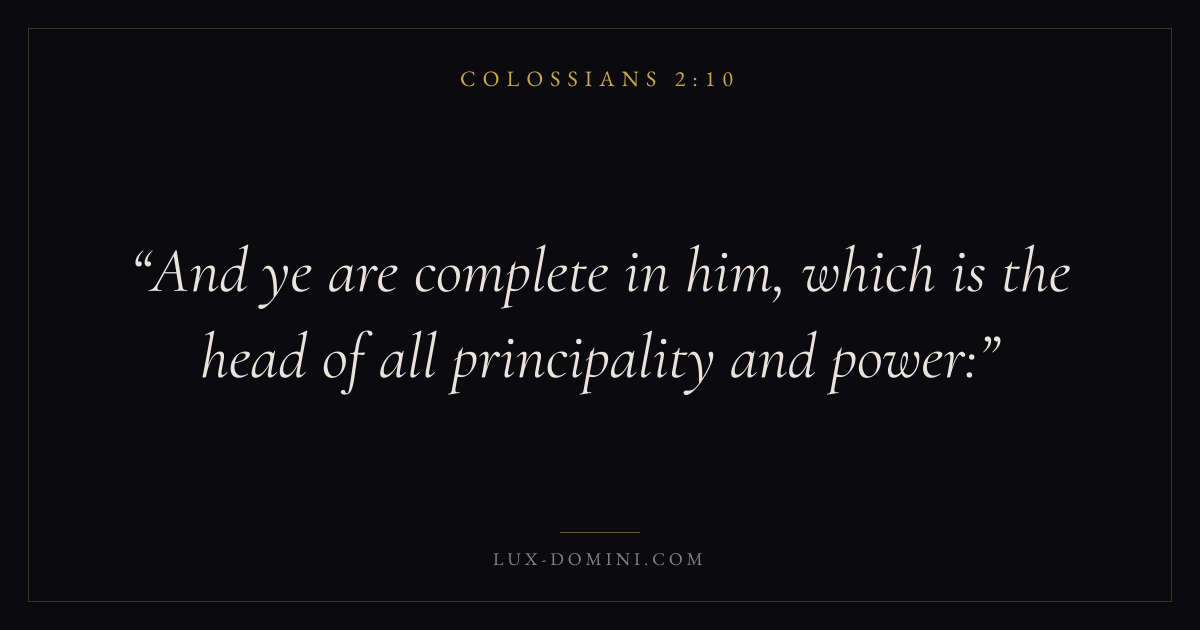 Books / Colossians / Chapter 2 / Verse 10 ← Colossians 2:9 Colossians 2:10 Colossians 2:11 → And ye are complete in him, which is the head of all principality and power: Download verse card Share on Twitter Share on Facebook Pin it ✦ Key themes FaithWisdomSupremacy of ChristFullness Read with Colossians 2:8Colossians 2:9Hebrews 11:1Romans 10:17 Related topics Bible verses about faithBible verses about wisdom ✦ Colossians Chapter 2 verses V. 1 V. 2 V. 3 V. 4 V. 5 V. 6 V. 7 V. 8 V. 9 V. 10 V. 11 V. 12 V. 13 V. 14 V. 15 V. 16 V. 17 V. 18 V. 19 V. 20 V. 21 V. 22 V. 23