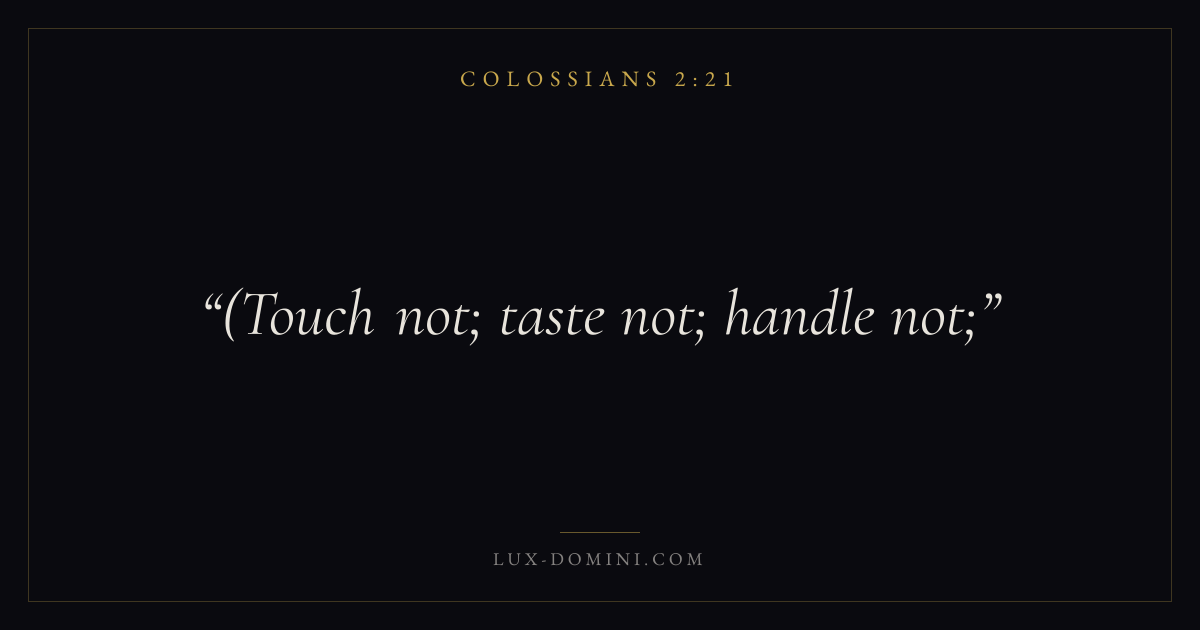 Books / Colossians / Chapter 2 / Verse 21 ← Colossians 2:20 Colossians 2:21 Colossians 2:22 → (Touch not; taste not; handle not; Download verse card Share on Twitter Share on Facebook Pin it ✦ Key themes WisdomHumilitySupremacy of ChristFullness Read with Colossians 2:20Colossians 2:22Proverbs 1:7James 1:5 Related topics Bible verses about wisdomBible verses about humility ✦ Colossians Chapter 2 verses V. 1 V. 2 V. 3 V. 4 V. 5 V. 6 V. 7 V. 8 V. 9 V. 10 V. 11 V. 12 V. 13 V. 14 V. 15 V. 16 V. 17 V. 18 V. 19 V. 20 V. 21 V. 22 V. 23