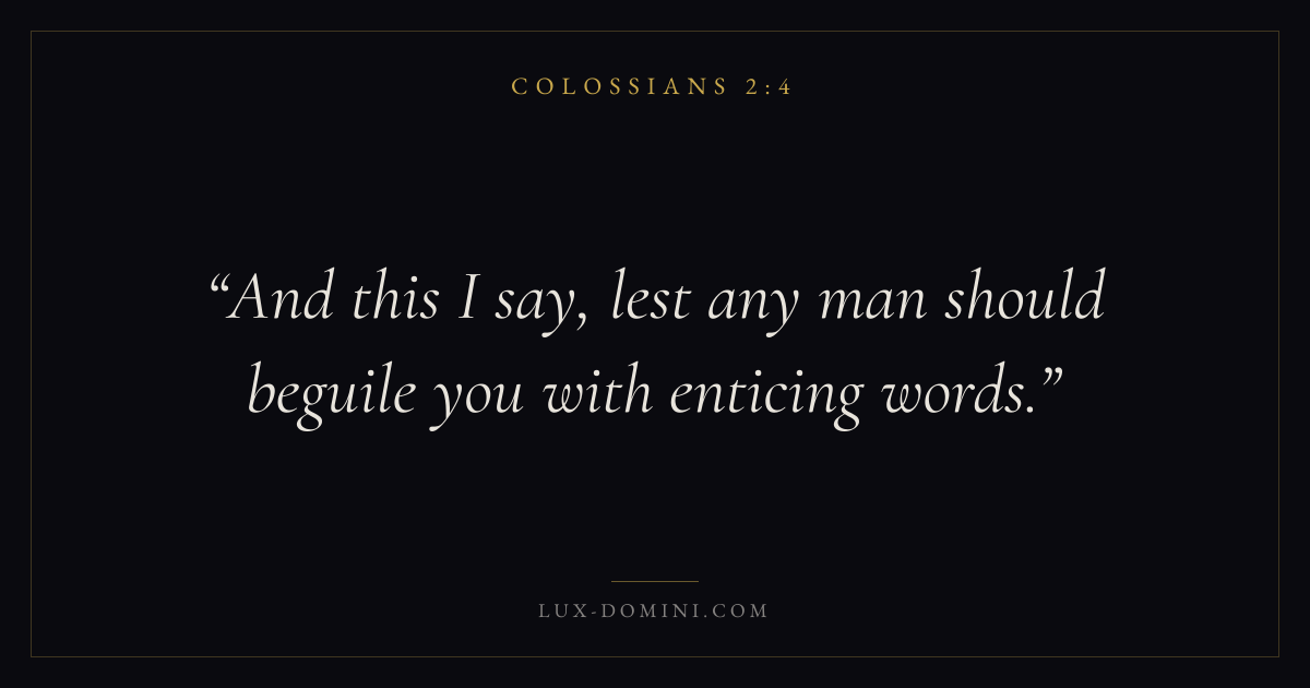Books / Colossians / Chapter 2 / Verse 4 ← Colossians 2:3 Colossians 2:4 Colossians 2:5 → And this I say, lest any man should beguile you with enticing words. Download verse card Share on Twitter Share on Facebook Pin it ✦ Key themes FaithWisdomTruthSupremacy of Christ Read with Colossians 2:1Colossians 2:2Hebrews 11:1Romans 10:17 Related topics Bible verses about faithBible verses about wisdomBible verses about truth ✦ Colossians Chapter 2 verses V. 1 V. 2 V. 3 V. 4 V. 5 V. 6 V. 7 V. 8 V. 9 V. 10 V. 11 V. 12 V. 13 V. 14 V. 15 V. 16 V. 17 V. 18 V. 19 V. 20 V. 21 V. 22 V. 23