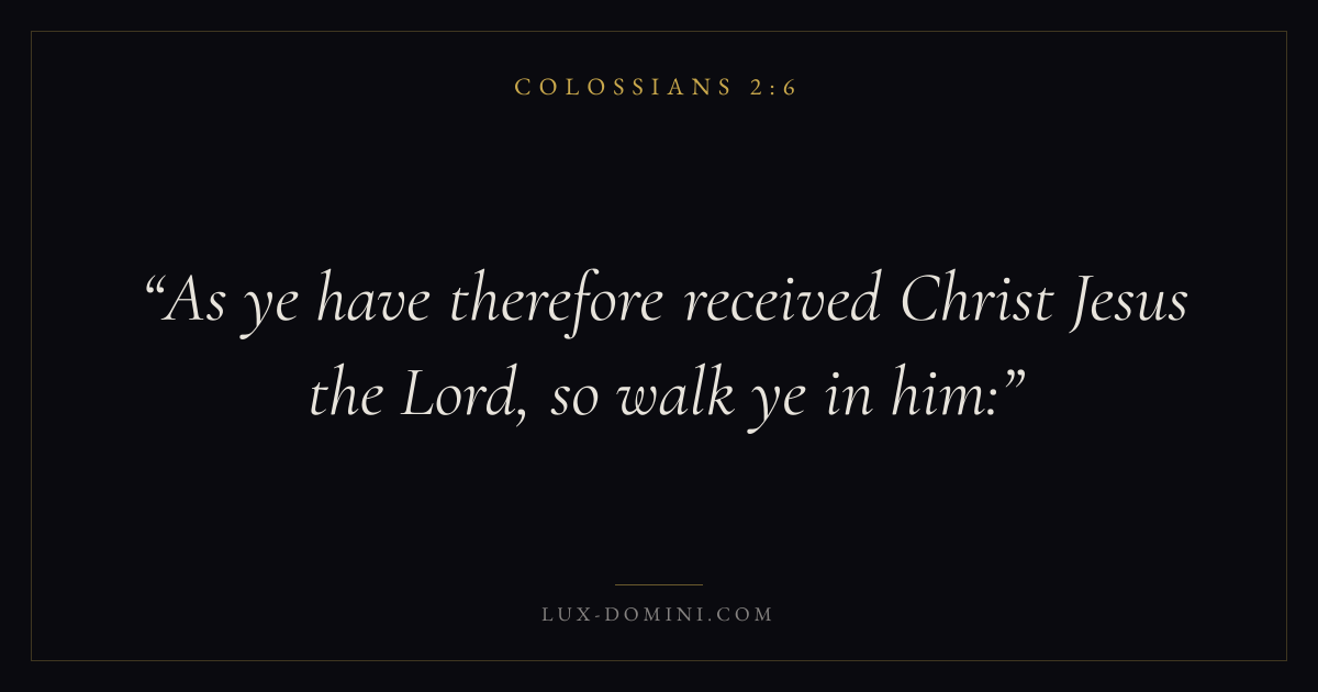 Books / Colossians / Chapter 2 / Verse 6 ← Colossians 2:5 Colossians 2:6 Colossians 2:7 → As ye have therefore received Christ Jesus the Lord, so walk ye in him: Download verse card Share on Twitter Share on Facebook Pin it ✦ Key themes FaithWisdomTruthSupremacy of Christ Read with Colossians 2:7Hebrews 11:1Romans 10:17Proverbs 1:7 Related topics Bible verses about faithBible verses about wisdomBible verses about truth ✦ Colossians Chapter 2 verses V. 1 V. 2 V. 3 V. 4 V. 5 V. 6 V. 7 V. 8 V. 9 V. 10 V. 11 V. 12 V. 13 V. 14 V. 15 V. 16 V. 17 V. 18 V. 19 V. 20 V. 21 V. 22 V. 23