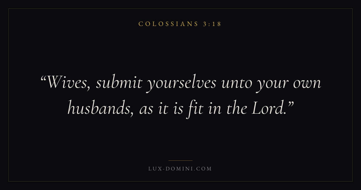 Books / Colossians / Chapter 3 / Verse 18 ← Colossians 3:17 Colossians 3:18 Colossians 3:19 → Wives, submit yourselves unto your own husbands, as it is fit in the Lord. Download verse card Share on Twitter Share on Facebook Pin it ✦ Key themes WisdomGraceSupremacy of ChristFullness Read with Colossians 3:19Proverbs 1:7James 1:5Ephesians 2:8 Related topics Bible verses about wisdomBible verses about grace ✦ Colossians Chapter 3 verses V. 1 V. 2 V. 3 V. 4 V. 5 V. 6 V. 7 V. 8 V. 9 V. 10 V. 11 V. 12 V. 13 V. 14 V. 15 V. 16 V. 17 V. 18 V. 19 V. 20 V. 21 V. 22 V. 23 V. 24 V. 25