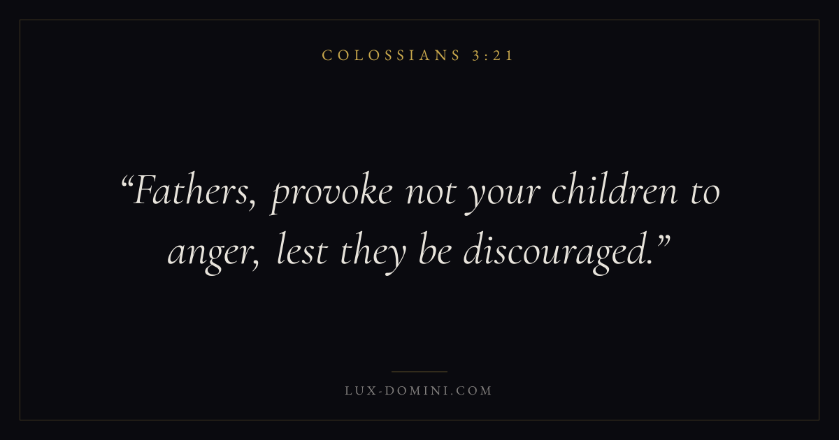 Books / Colossians / Chapter 3 / Verse 21 ← Colossians 3:20 Colossians 3:21 Colossians 3:22 → Fathers, provoke not your children to anger, lest they be discouraged. Download verse card Share on Twitter Share on Facebook Pin it ✦ Key themes WisdomGraceSupremacy of ChristFullness Read with Colossians 3:20Proverbs 1:7James 1:5Ephesians 2:8 Related topics Bible verses about wisdomBible verses about grace ✦ Colossians Chapter 3 verses V. 1 V. 2 V. 3 V. 4 V. 5 V. 6 V. 7 V. 8 V. 9 V. 10 V. 11 V. 12 V. 13 V. 14 V. 15 V. 16 V. 17 V. 18 V. 19 V. 20 V. 21 V. 22 V. 23 V. 24 V. 25
