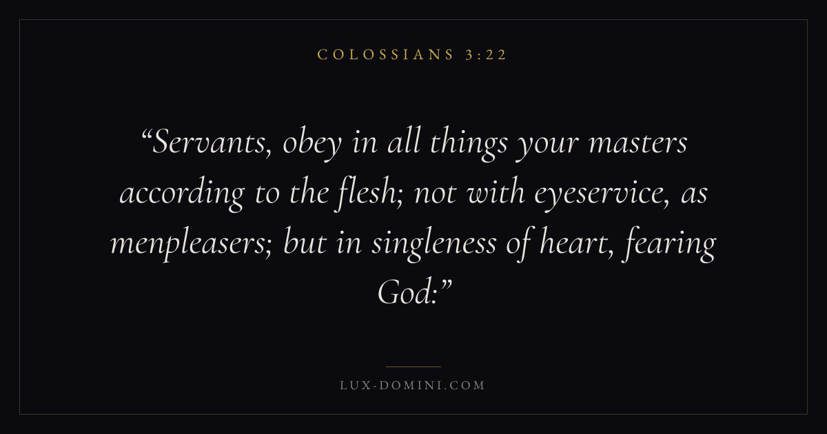 Servants, obey in all things your masters according to the flesh; not with eyeservice, as menpleasers; but in singleness of heart, fearing God: