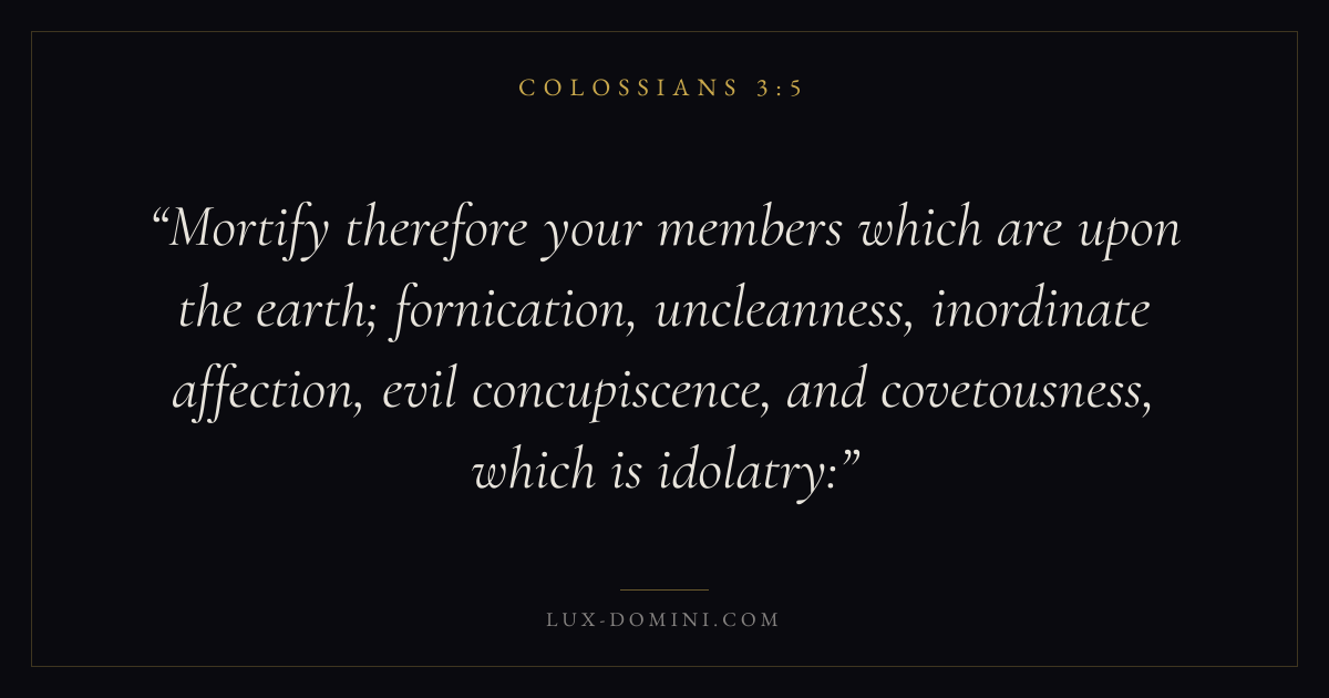 Mortify therefore your members which are upon the earth; fornication, uncleanness, inordinate affection, evil concupiscence, and covetousness, which is idolatry: