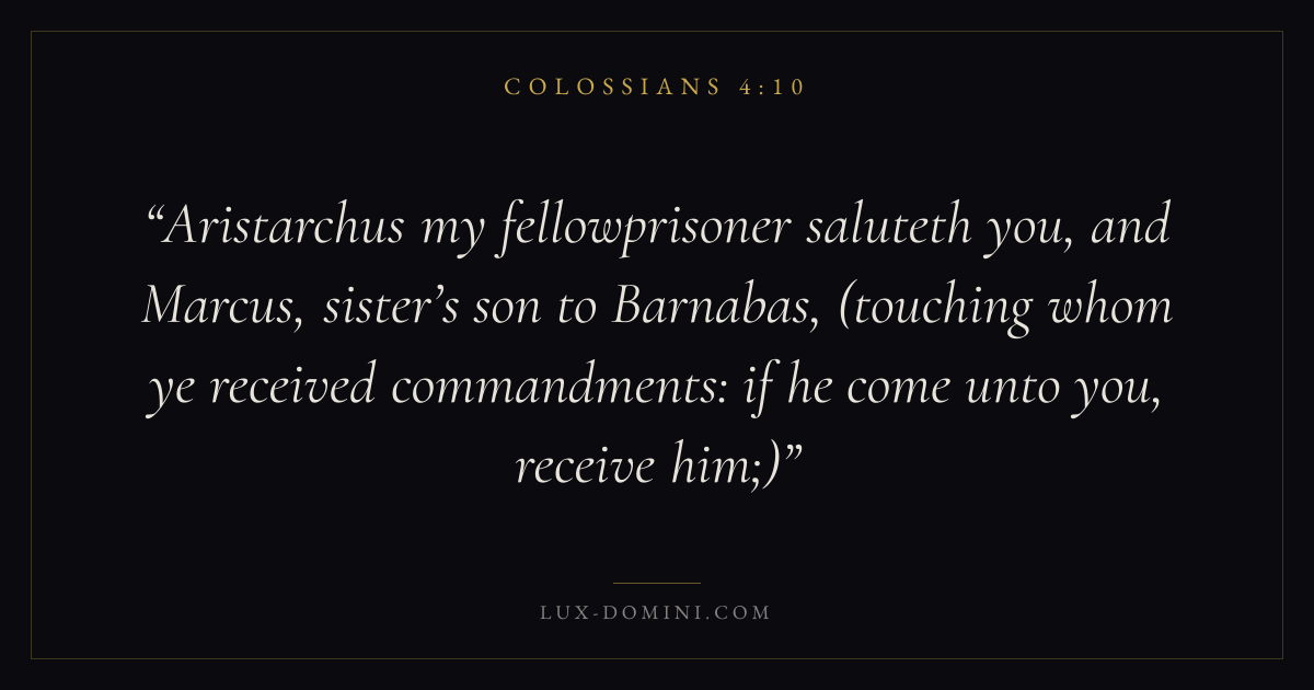Aristarchus my fellowprisoner saluteth you, and Marcus, sister’s son to Barnabas, (touching whom ye received commandments: if he come unto you, receive him;)