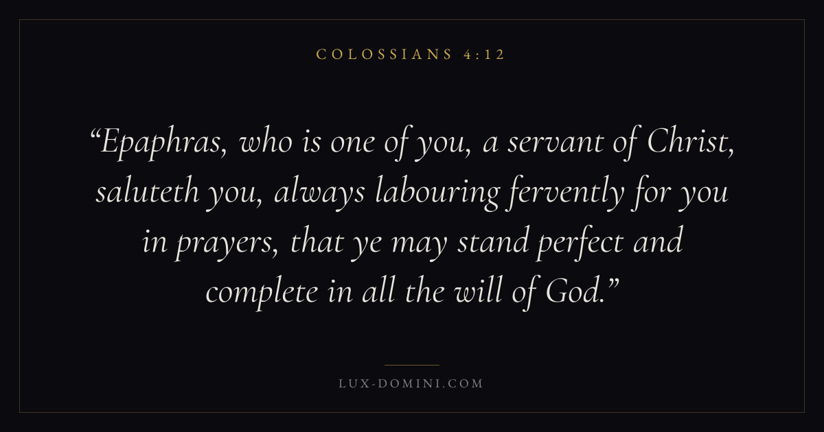 Epaphras, who is one of you, a servant of Christ, saluteth you, always labouring fervently for you in prayers, that ye may stand perfect and complete in all the will of God.