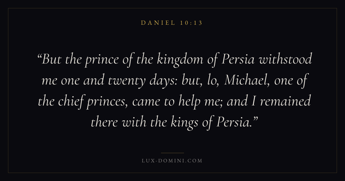 But the prince of the kingdom of Persia withstood me one and twenty days: but, lo, Michael, one of the chief princes, came to help me; and I remained there with the kings of Persia.