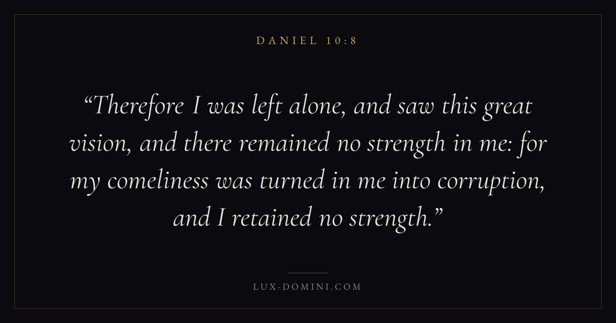 Therefore I was left alone, and saw this great vision, and there remained no strength in me: for my comeliness was turned in me into corruption, and I retained no strength.