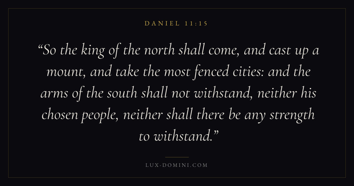 So the king of the north shall come, and cast up a mount, and take the most fenced cities: and the arms of the south shall not withstand, neither his chosen people, neither shall there be any strength to withstand.