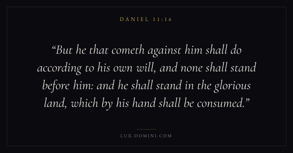 But he that cometh against him shall do according to his own will, and none shall stand before him: and he shall stand in the glorious land, which by his hand shall be consumed.