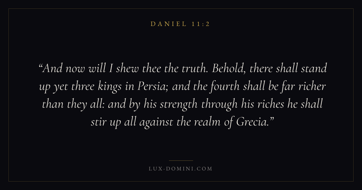 And now will I shew thee the truth. Behold, there shall stand up yet three kings in Persia; and the fourth shall be far richer than they all: and by his strength through his riches he shall stir up all against the realm of Grecia.