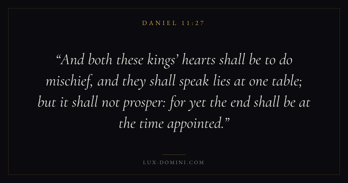 And both these kings’ hearts shall be to do mischief, and they shall speak lies at one table; but it shall not prosper: for yet the end shall be at the time appointed.