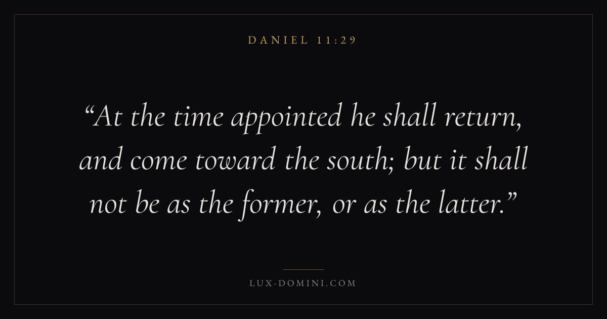 At the time appointed he shall return, and come toward the south; but it shall not be as the former, or as the latter.