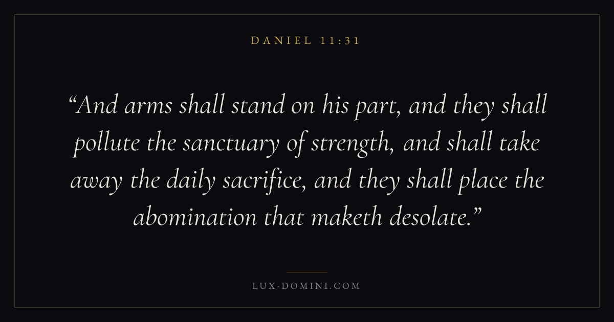 And arms shall stand on his part, and they shall pollute the sanctuary of strength, and shall take away the daily sacrifice, and they shall place the abomination that maketh desolate.