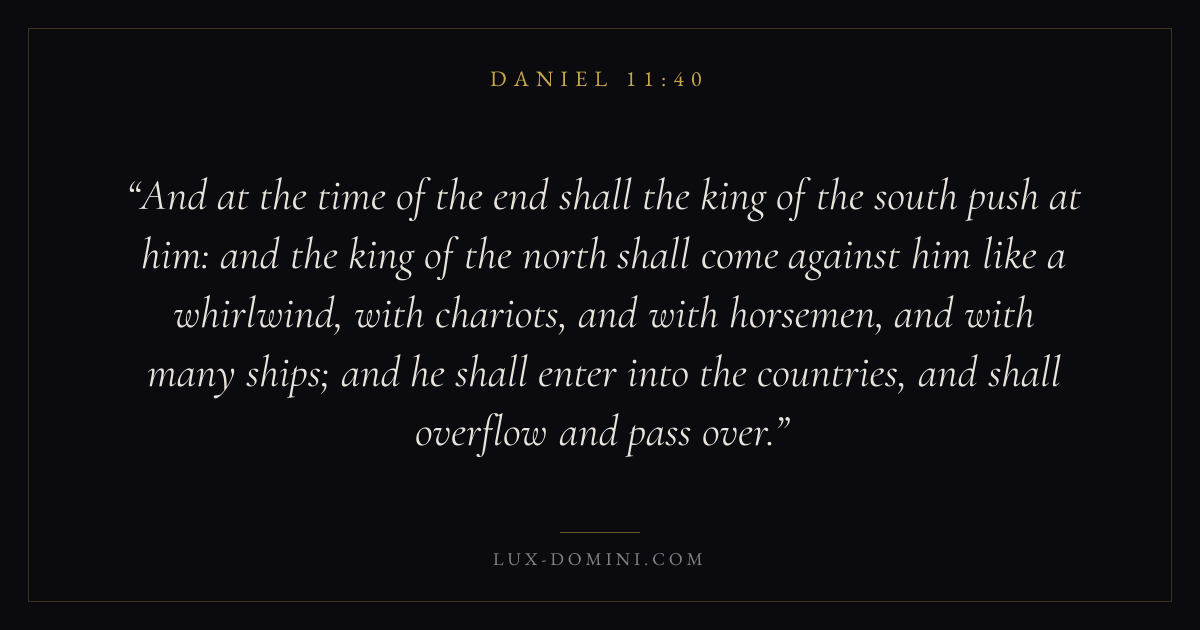 And at the time of the end shall the king of the south push at him: and the king of the north shall come against him like a whirlwind, with chariots, and with horsemen, and with many ships; and he shall enter into the countries, and shall overflow and pass over.